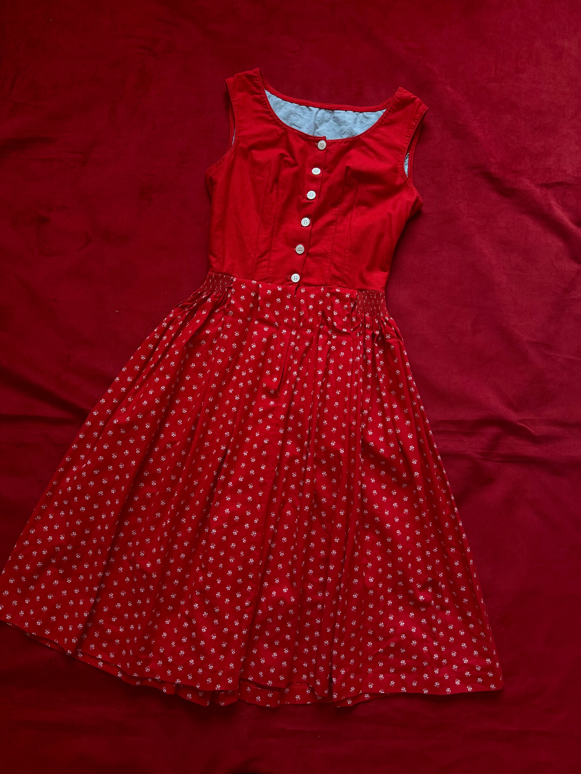 Abito dal colore stupendo, presumibilmente di sartoria. Parte superiore molto attillata, gonna svasata e vita elasticizzata. Come tutti gli abiti tirolese sul davanti è aperto, va inserito un bottoncino per tenerlo chiuso.