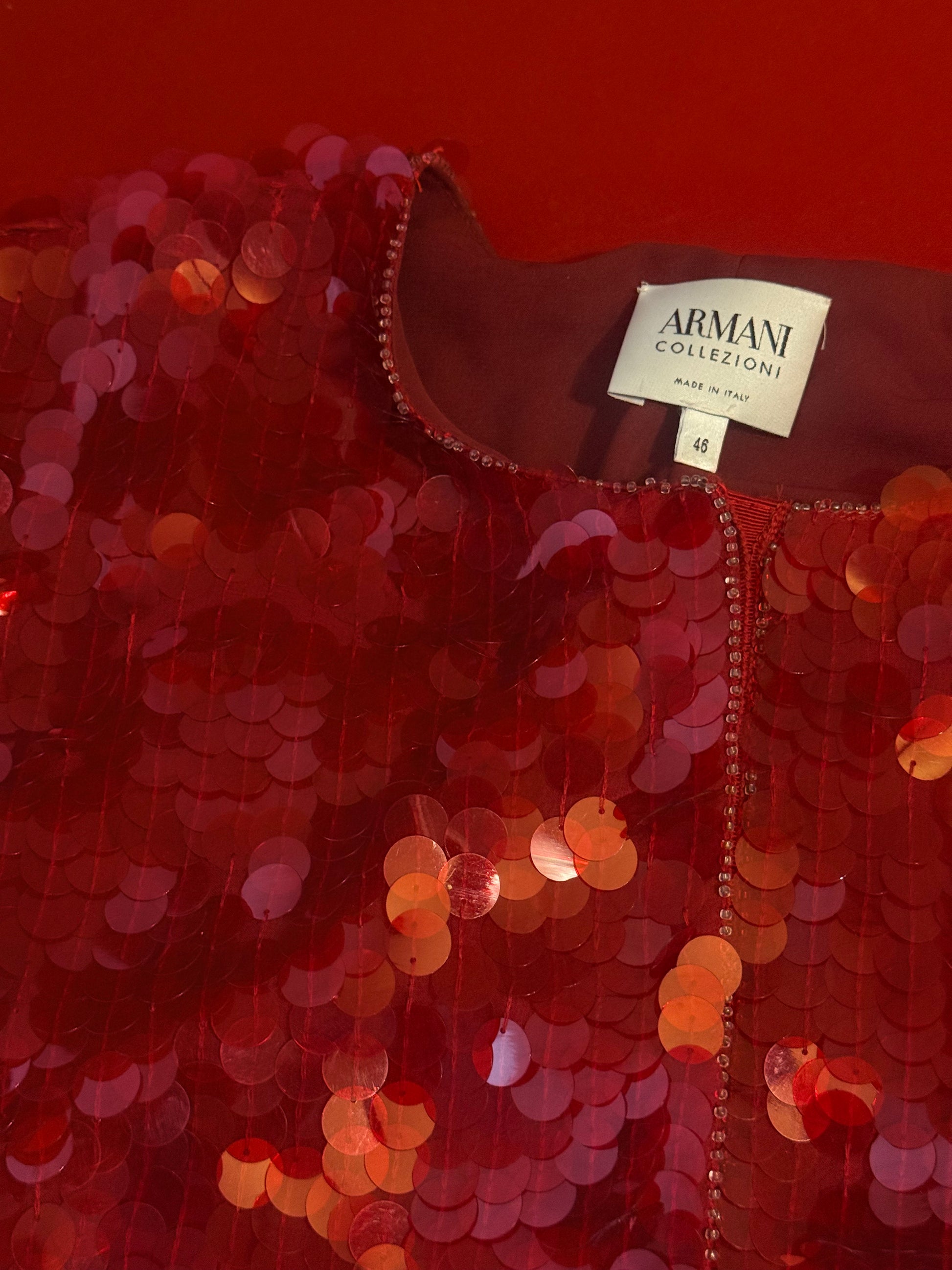 Meravigliosa giacca di Armani che cattura lo sguardo, in seta rosso con paillettes tono su tono. I bordi sono profilati con piccoli cristalli. Indossata e in movimento è incredibile.