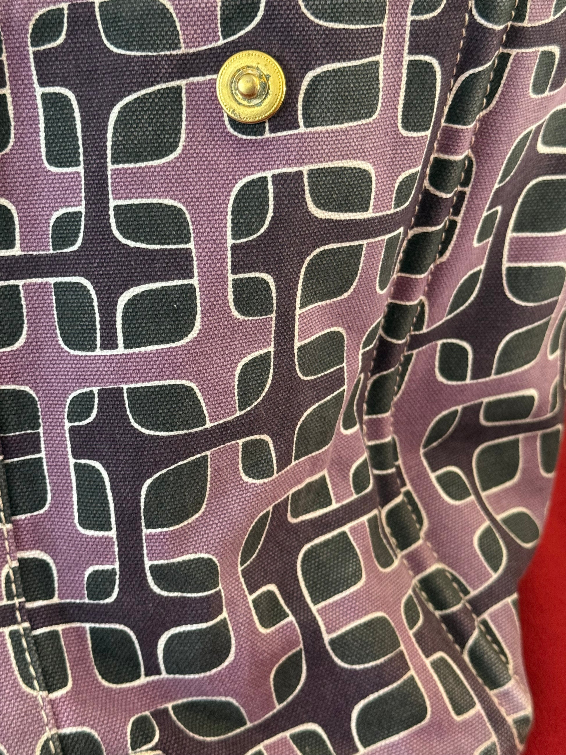 Questa borsa, chiamata anche "Giardiniera", fa parte della collezione "Print Collection" del 2010. Sui toni del viola, perfetta per tutte le stagioni. La borsa si può restringere o allargare grazie ai due bottoni laterali.