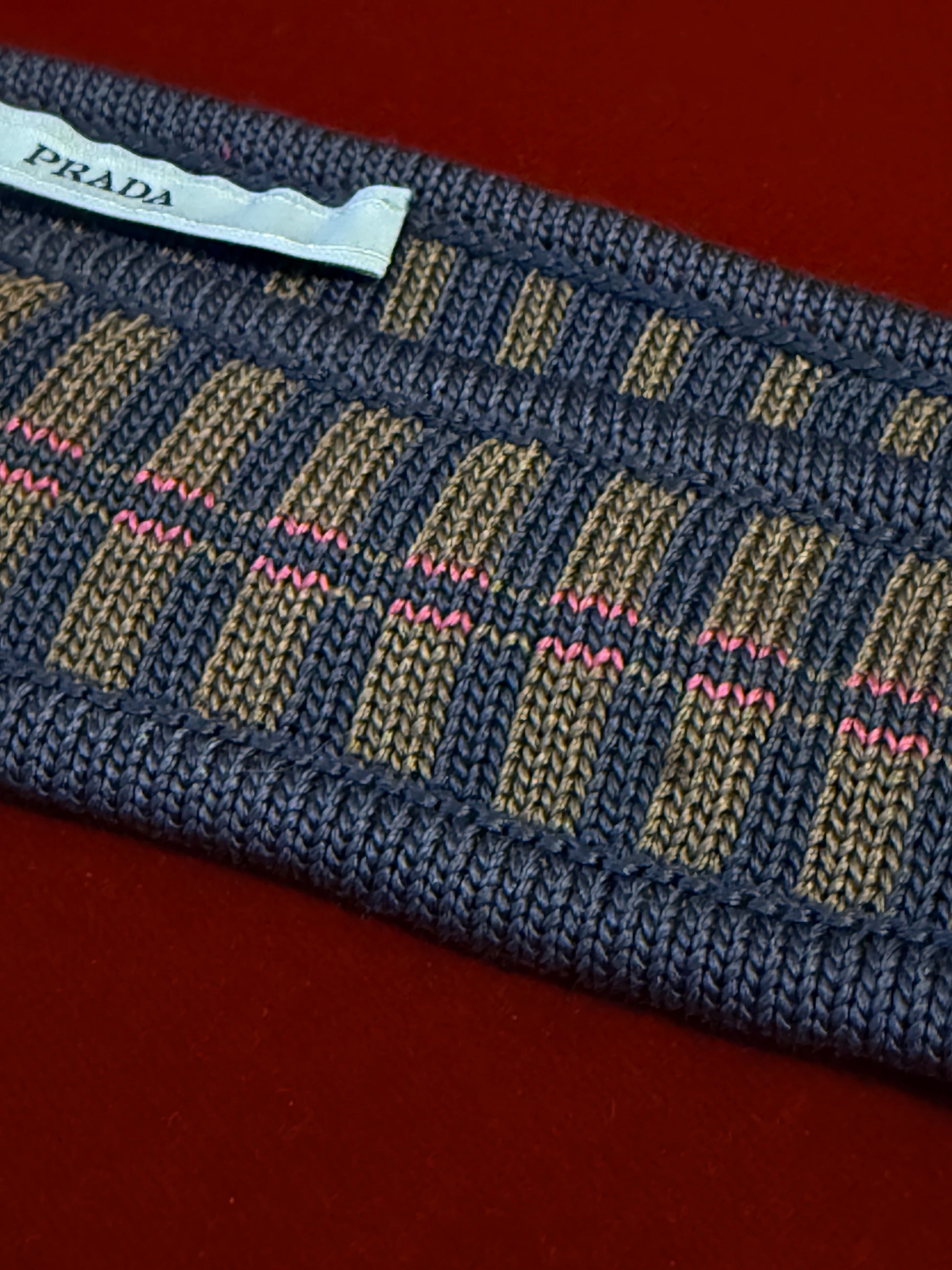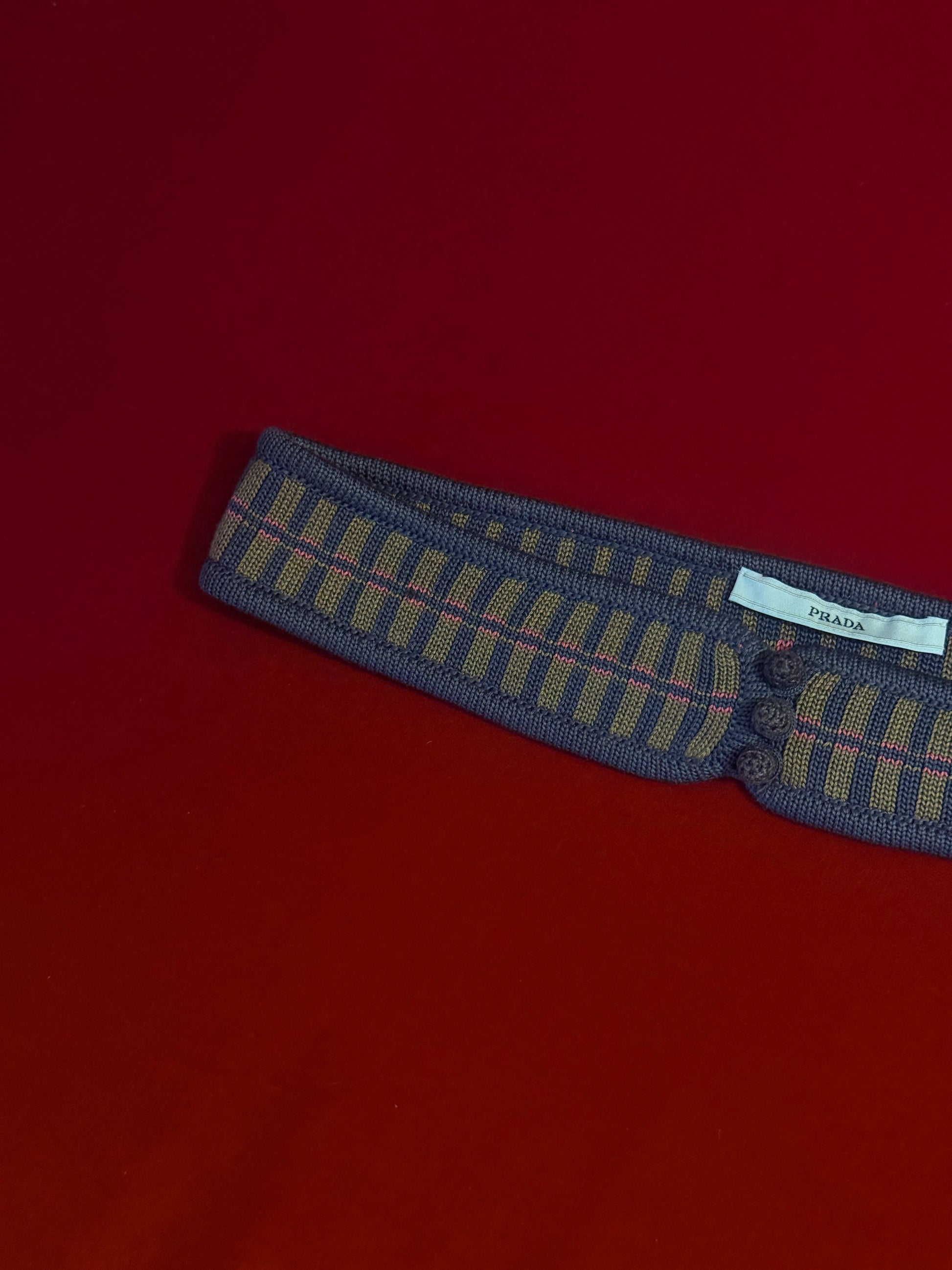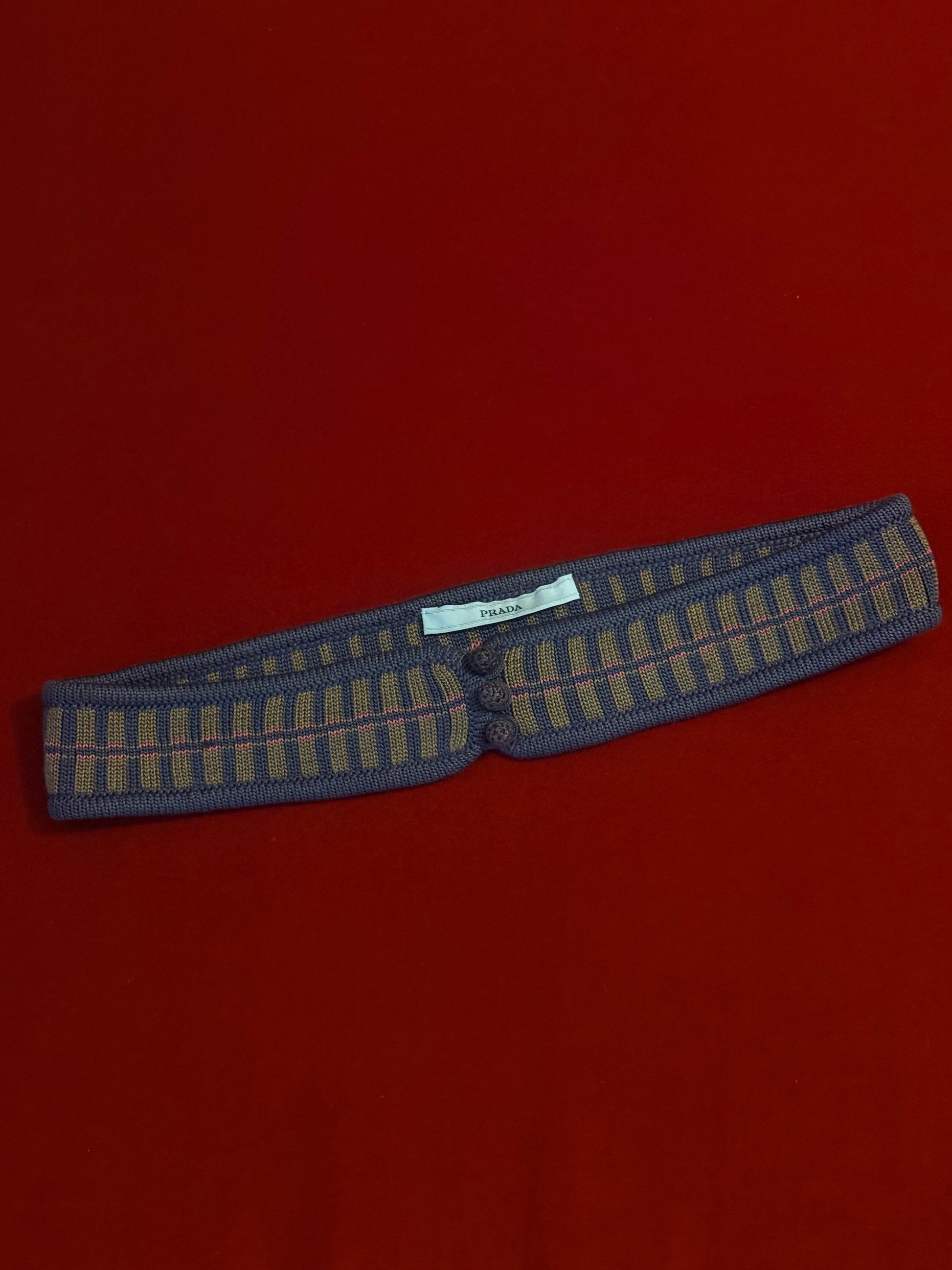 Un accessorio Prada molto particolare e ricercato, una cintura in seta sui toni del marrone/viola e rosa. Chiusura con 3 bottoncini.
