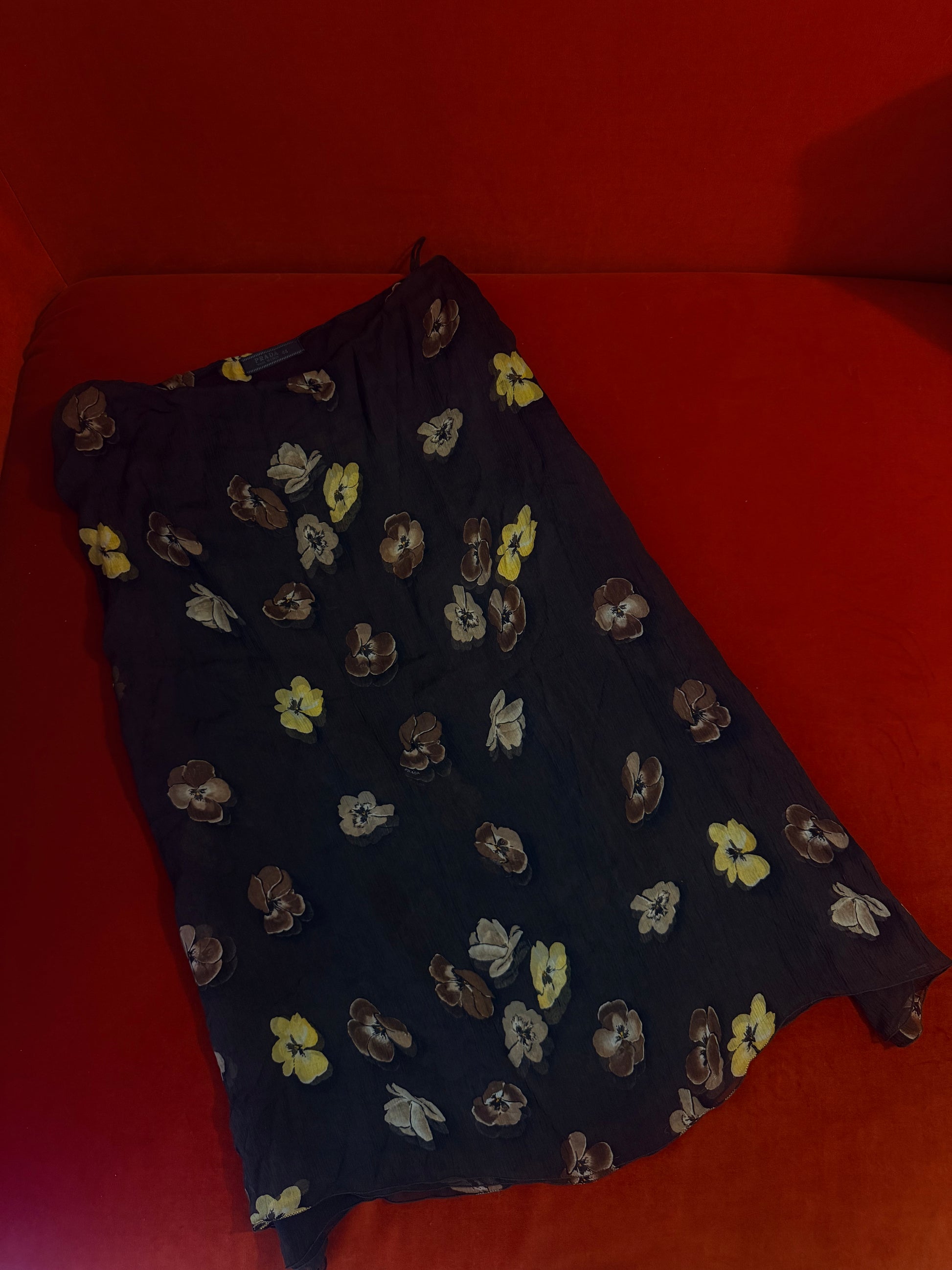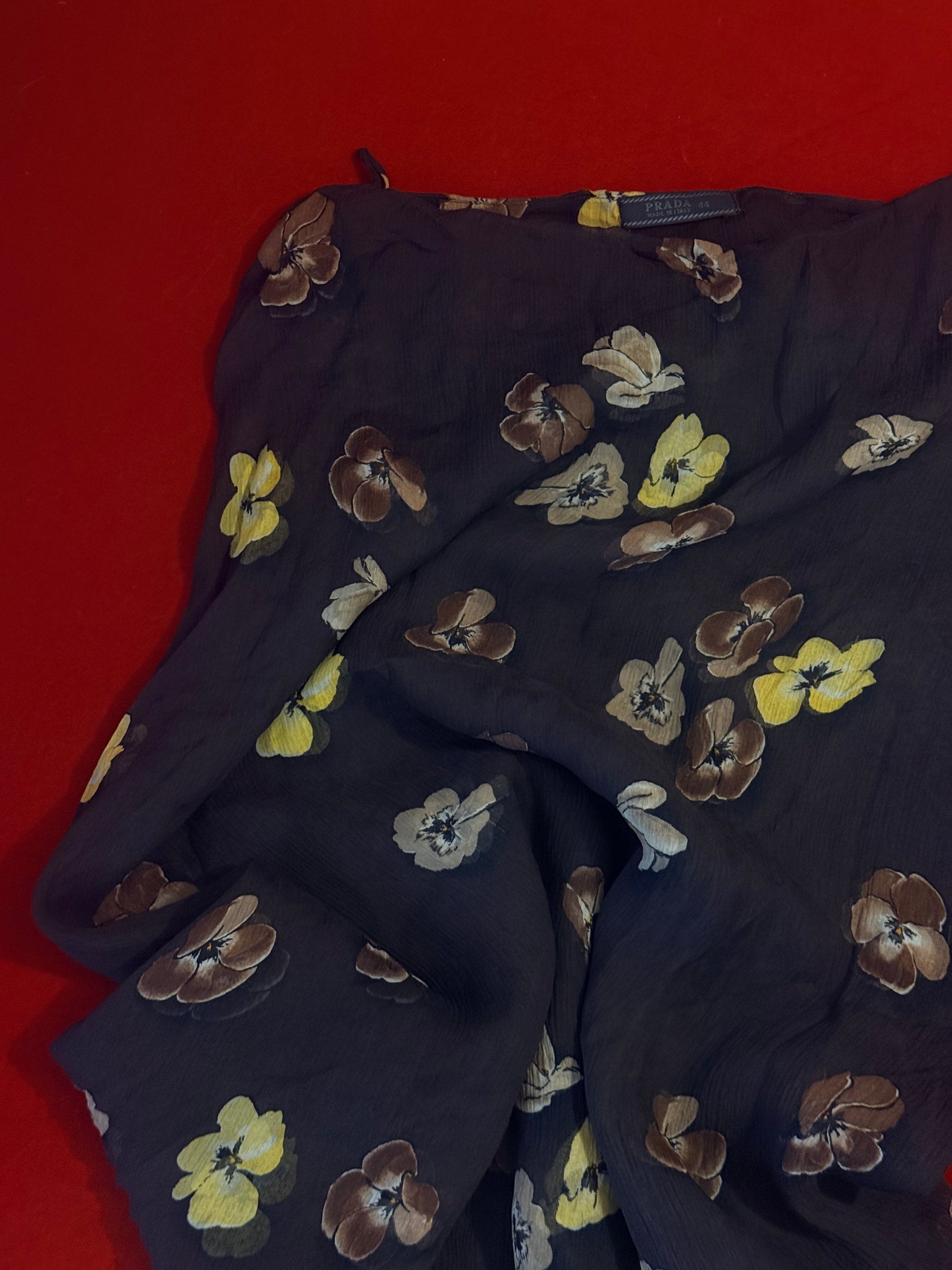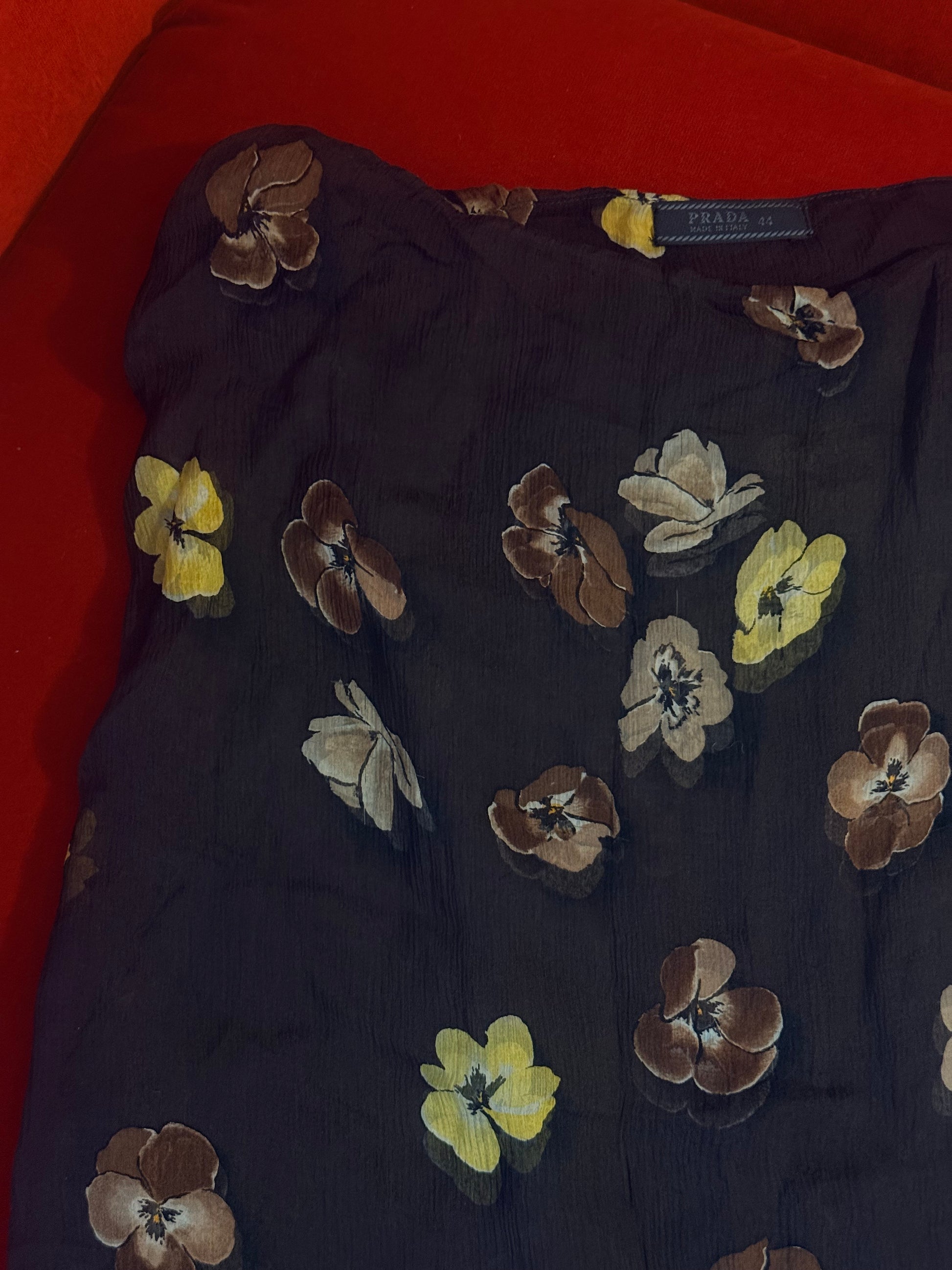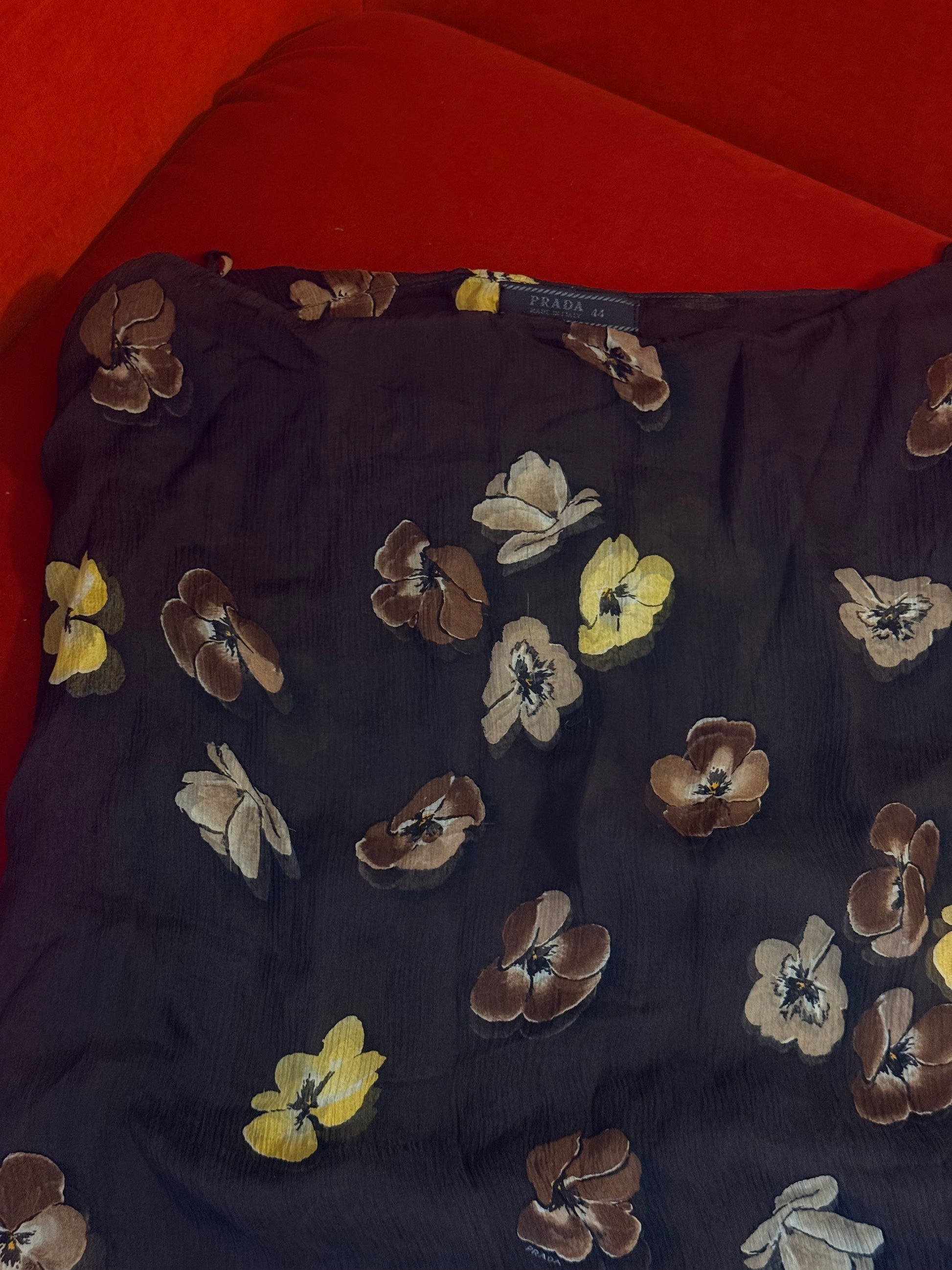 Un pezzo iconico della sfilata 2000 di Prada, in seta con fiori sui toni del giallo e marrone. La gonna è doppiata in seta, resta comunque leggermente trasparente. Un articolo da collezione.